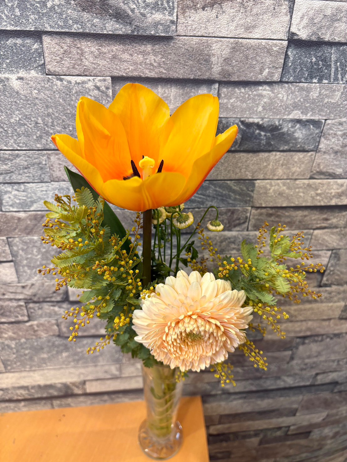 今週のお花は、ガーベラとチューリップ、ミモザなどです🌼