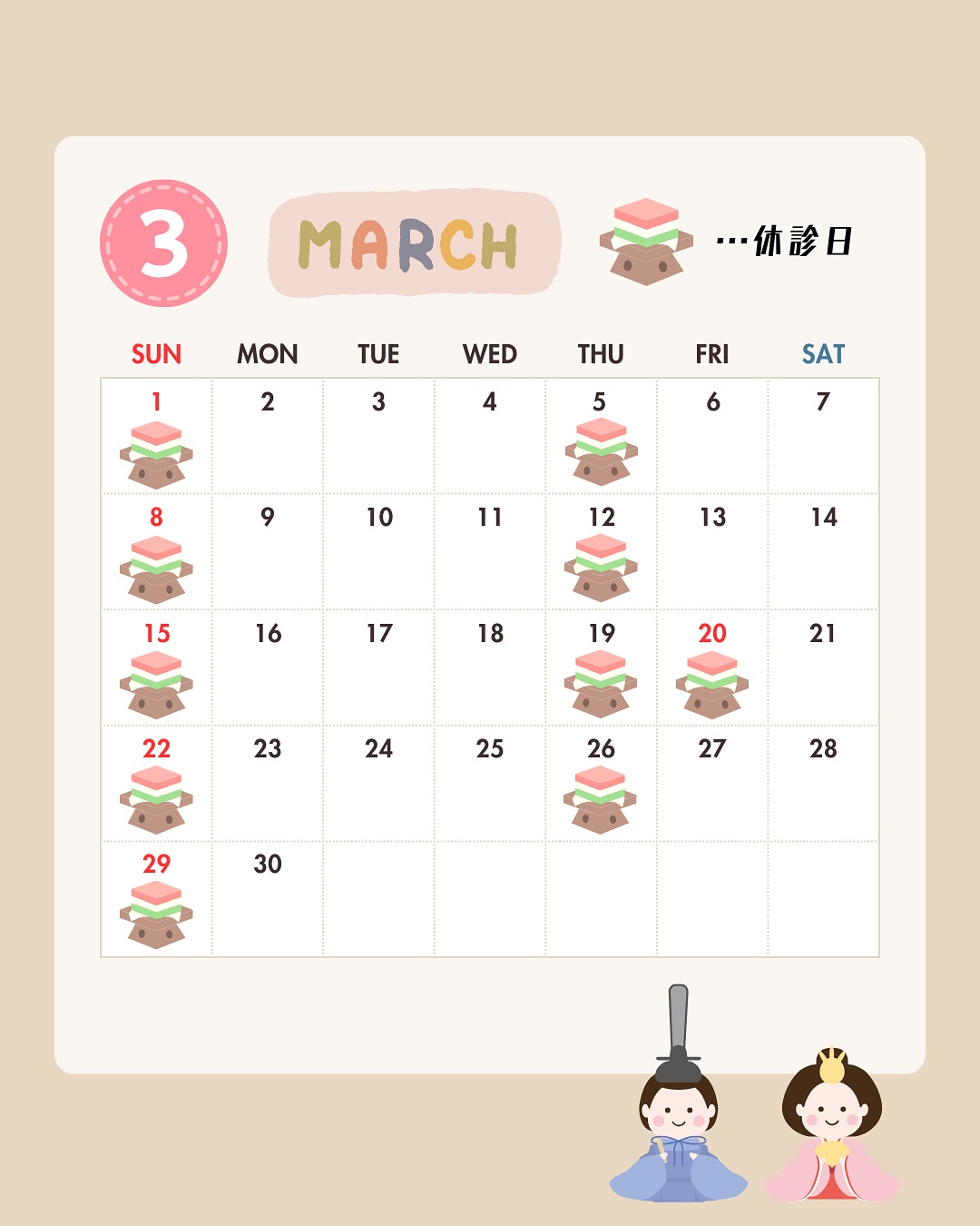3月の休診日のお知らせです🎎